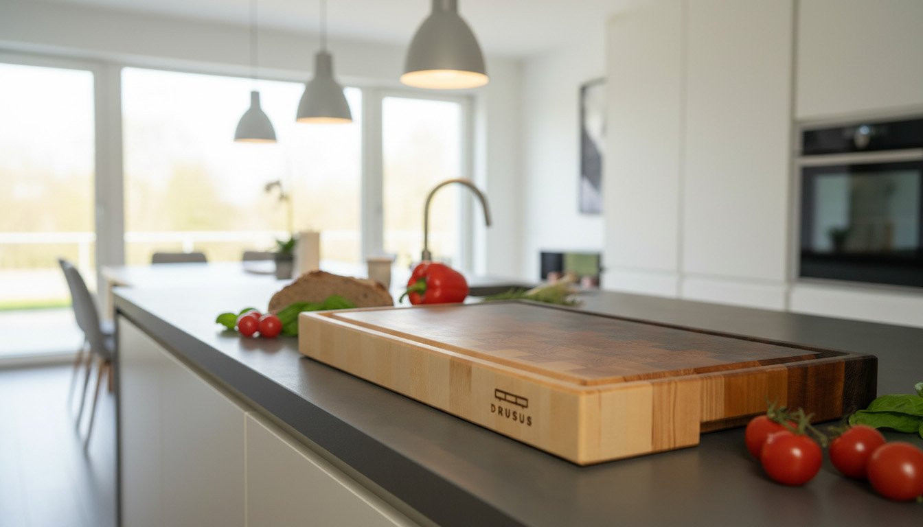 Culina Drusus ist mehr als ein Schneidebrett – es ist eine Studie in Balance. Gefertigt aus massivem Holz vereint es Schwere und Leichtigkeit in präziser Handarbeit. Die Oberfläche bleibt spürbar, geölt und matt – ein stiller Dialog zwischen Werkzeug und Material.